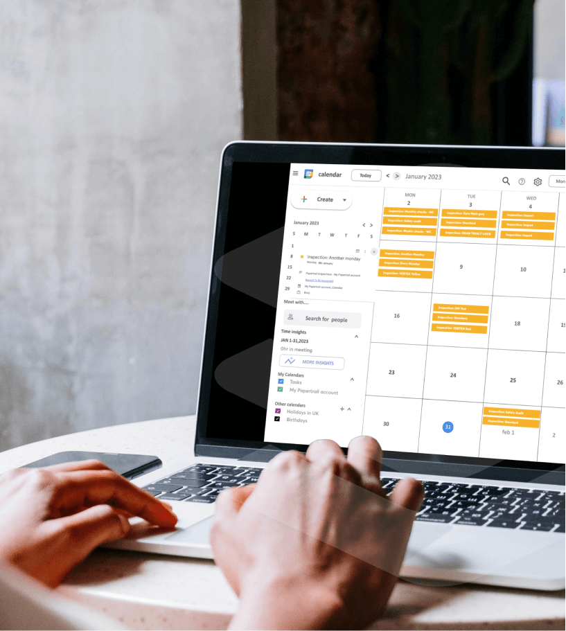 Papertrail’s iCal integration helps you stay on top of your inspections. iCal is supported by Outlook, Gmail, and Apple Mail, and ensures your schedule is synced across all your devices All upcoming inspection-related events are displayed conveniently alongside your other commitments with.